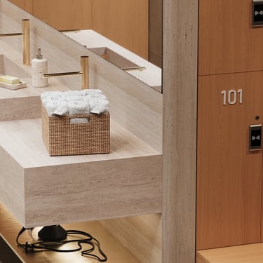 Connect Pilates Hall is a welcoming social hub where sunlit lounges, playful child-friendly corners, and warm timber lockers flow seamlessly around the central studio. Soft patterns, sculpted mirrors, and tactile stone details bring a resort-like ease that encourages guests to slow down, recharge, and connect before and after class.