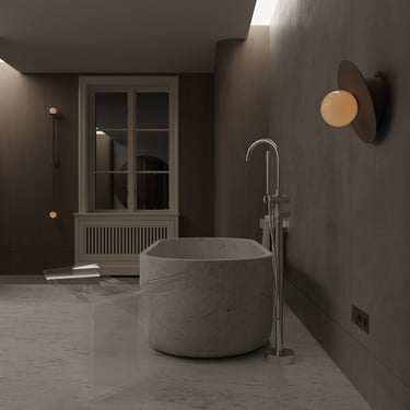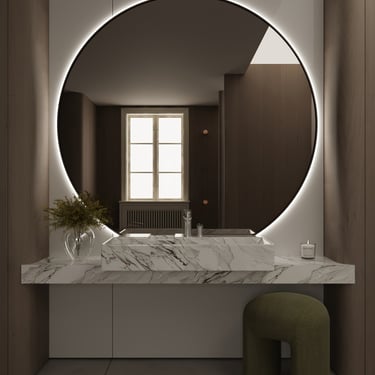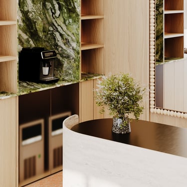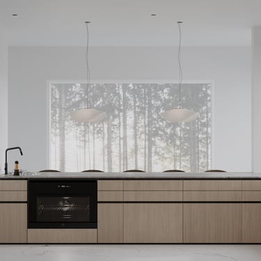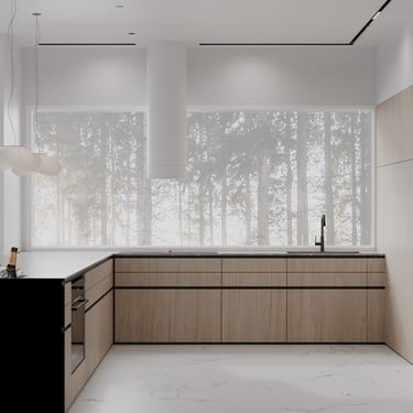 Villa is a serene family home where a pale timber kitchen and soft stone island open onto views of the surrounding landscape. Minimal lines, sculptural lighting, and a spa-like bathroom with marble and warm plaster give the interior a quiet, contemporary elegance that feels both luxurious and relaxed.