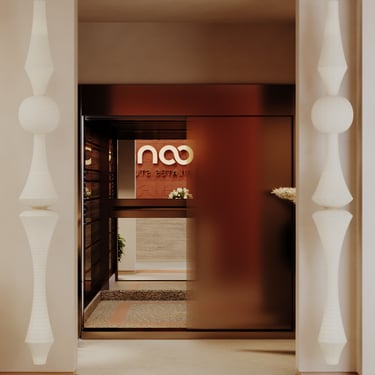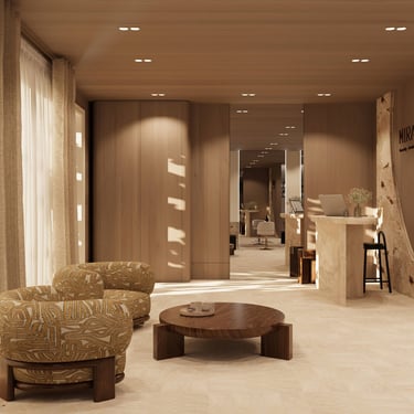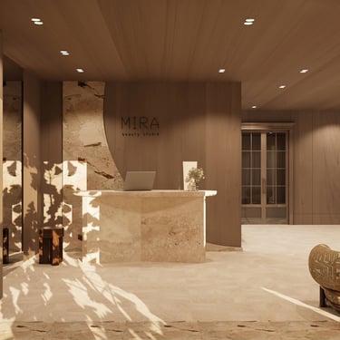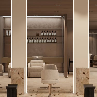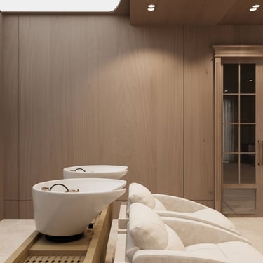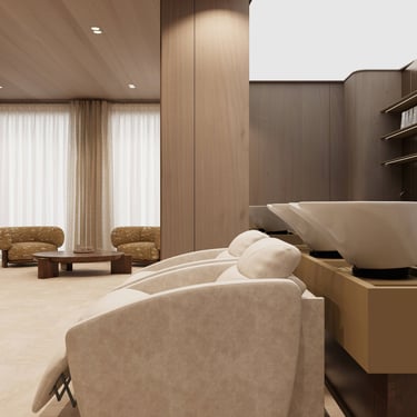 Salon is a softly lit beauty space where warm timber, textured stone, and plush seating create a cocooning calm from entrance to wash area. Gentle curves, layered neutrals, and a discreet back-bar composition give the interior a refined, hotel-like atmosphere that elevates every treatment ritual.