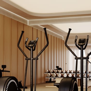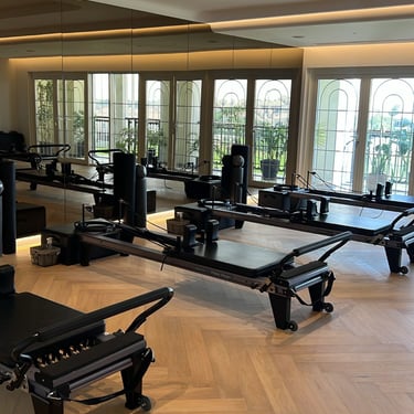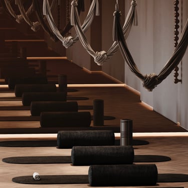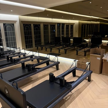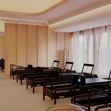 Connect Pilates Studio is a light-filled wellness space where warm neutrals, layered textiles, and soft drapery create a calm backdrop for focused movement and aerial practice. Generous mirrors, sculptural equipment, and rhythmic lighting lines emphasize the studio’s length, turning every workout zone into an intimate retreat within the larger space.