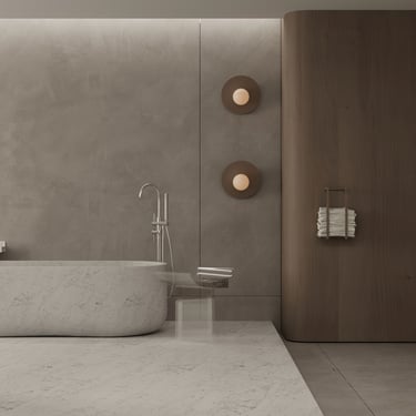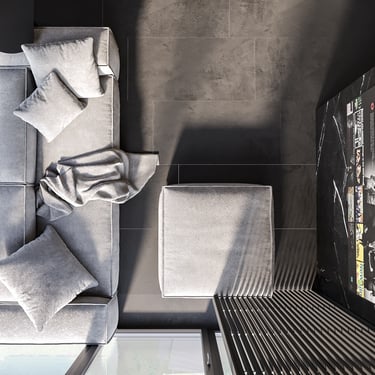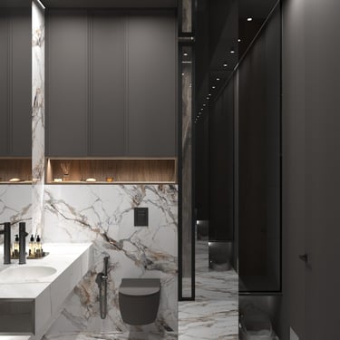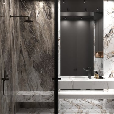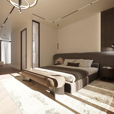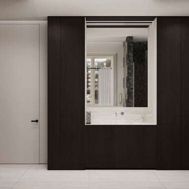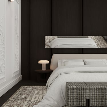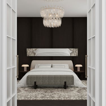 Villa is a moody master suite where deep charcoal paneling and pale stone create a dramatic, hotel-like backdrop for rest and retreat. Subtle symmetry, soft lighting, and a seamless transition between bedroom and spa bathroom give the space a quietly indulgent, boutique feel.