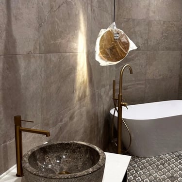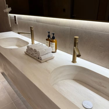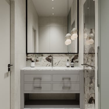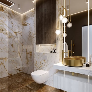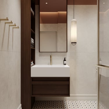 Vake Hill is a compact city apartment where bold stone surfaces and sculptural brass details elevate everyday rituals. A graphic mix of marble, warm metals, and soft neutrals brings a sense of glamour to both the open kitchen-living space and the spa-like bathroom suite.