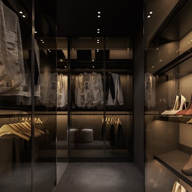 X2 Developer is a dramatic corner apartment where full-height glazing, dark timber, and expressive stone create a cinematic city backdrop. Layered lighting, monolithic marble surfaces, and a boutique-style dressing room give the interior a refined, hotel-inspired character that feels both bold and meticulously tailored.