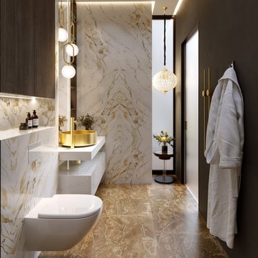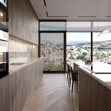 Villa Residence is a light-soaked hillside apartment where floor-to-ceiling glazing frames panoramic city views. Warm wood, veined marble, and golden accents flow from the open living area into a spa-like bathroom and tranquil bedroom, giving the interior a refined yet relaxed sense of contemporary luxury.