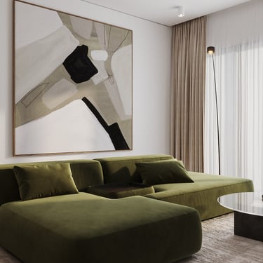 Grada is a warm, contemporary home where a deep green modular sofa and large-scale abstract art anchor an open living space. Softly lit wood, stone surfaces, and caramel leather dining chairs create a refined atmosphere that feels both generous for entertaining and quietly intimate for everyday living.