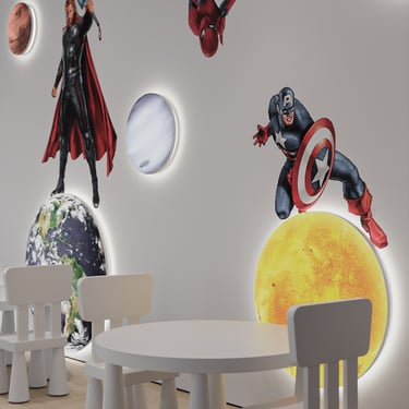 Sweet-shop is a playful hybrid of kids’ club and café, where a bright superhero-themed playroom opens into a cozy corner for parents. Soft woods, curved seating, and warm lighting create an inviting backdrop for shared treats, quiet conversations, and children’s imagination to run free.